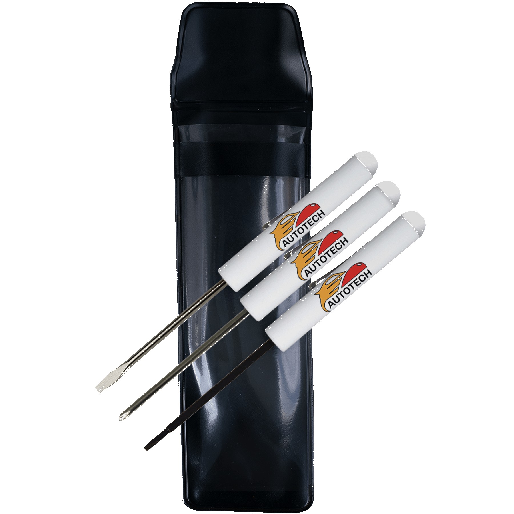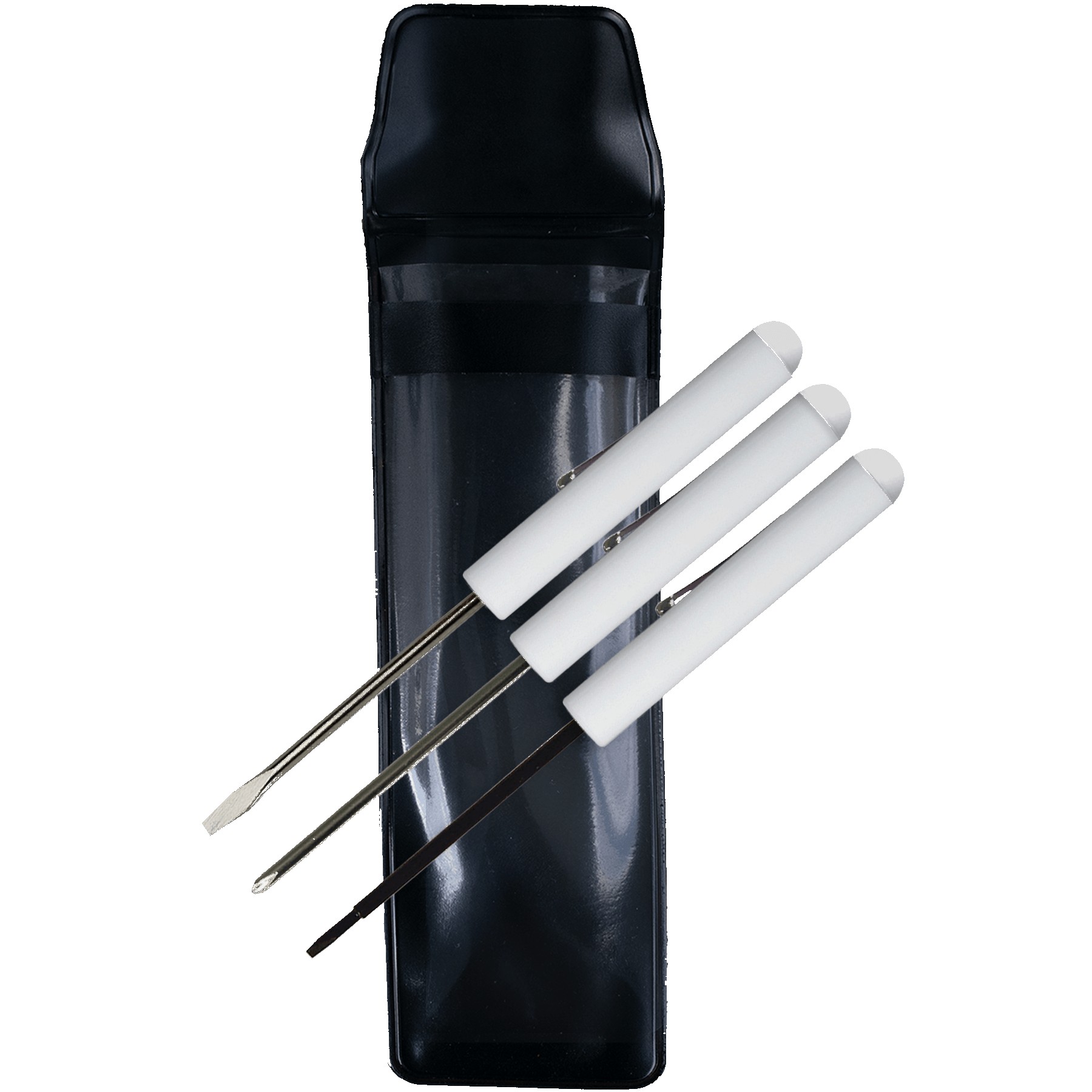Set includes F8801 Pocket screwdriver – Flat Tip, F8805 Pocket Screwdriver – #0 Phillips head, F8812 Pocket screwdriver – 2.5 mm Tech blade, stored in a vinyl pouch. Screwdriver barrels will white with the same imprint on all. The vinyl pouch is constructed of black vinyl with a clear view front. Complies with Prop 65. 6.5″ H x 2″ W x 0.5″ D