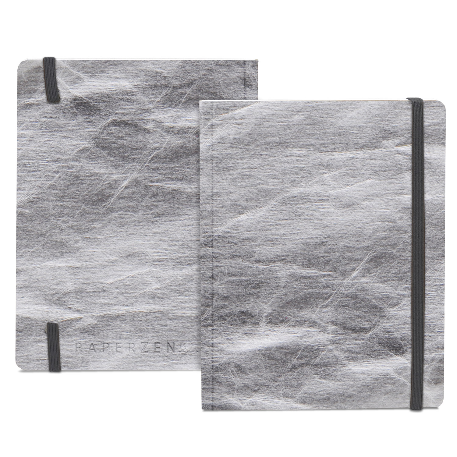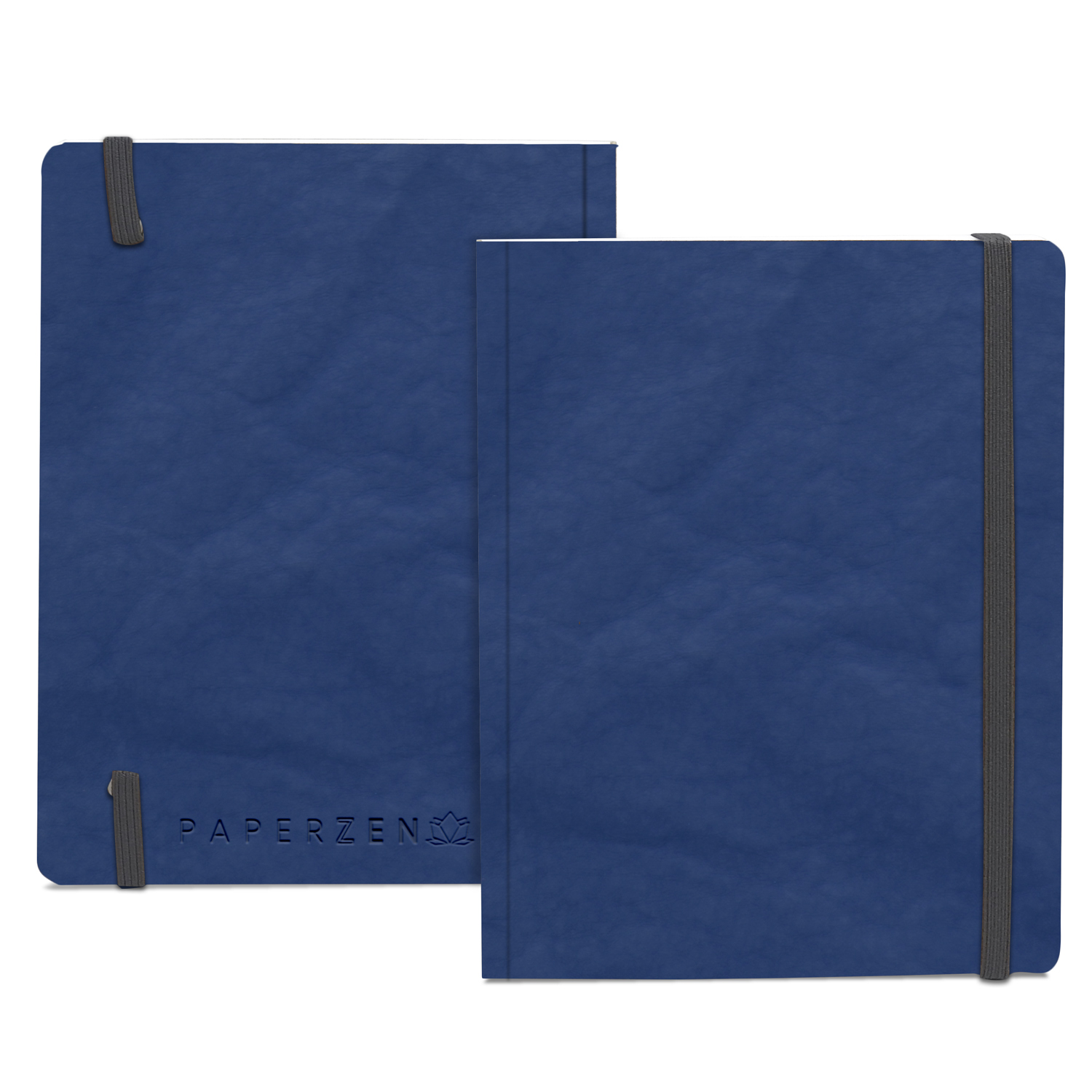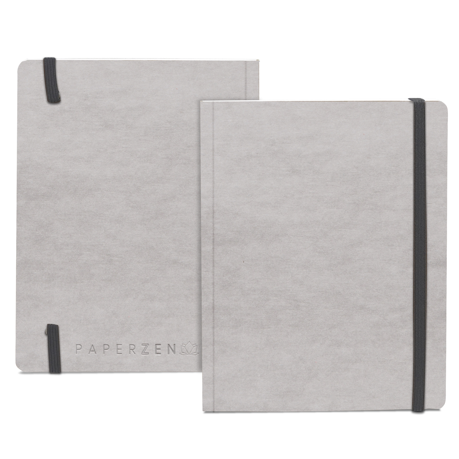 Perfect bound with side scorings for easy opening, Flat elastic closure (choose from 12 colors) & rounded corners. Durable, lightweight, washable and sustainable “jeans tags” material. Unit cost includes 100 white recycled sheets – 60# text | college ruled. Standard graph, blank or dot-grid sheets are available at no additional cost. Complies with FSC, Prop 65. 7″ W x 9″ L