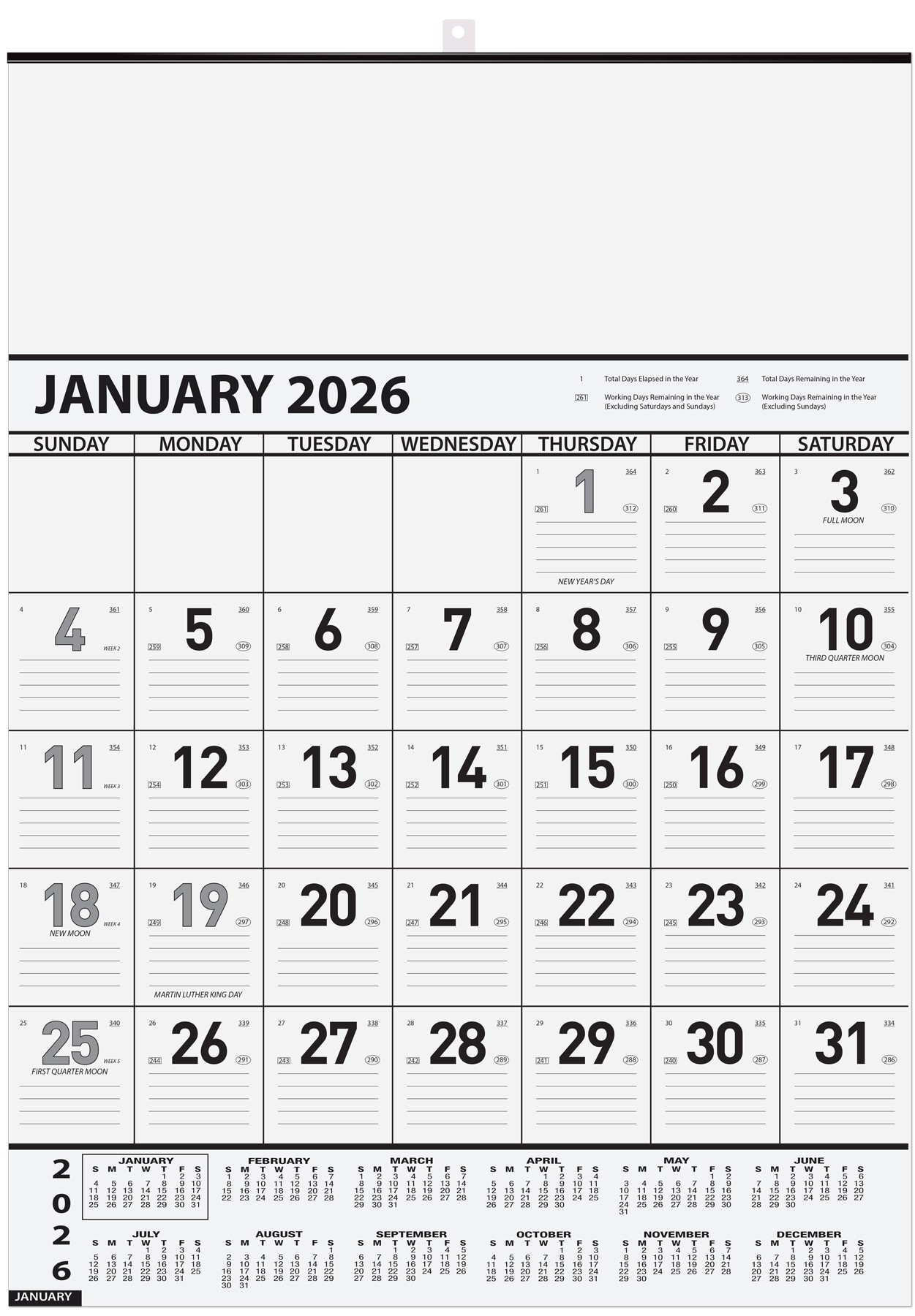 This calendar features 13 sheets of 50 Lb. white offset paper and a black tin at the top with a hanger. Includes 13 months (December to December) with memo lines in date blocks and symbols denoting days elapsed and remaining in the year, work days remaining without Saturdays and Sundays, and work days remaining without Sundays, all pre-printed in black. Also includes American and major Canadian holidays and moon phases. 18″ W x 25″ H