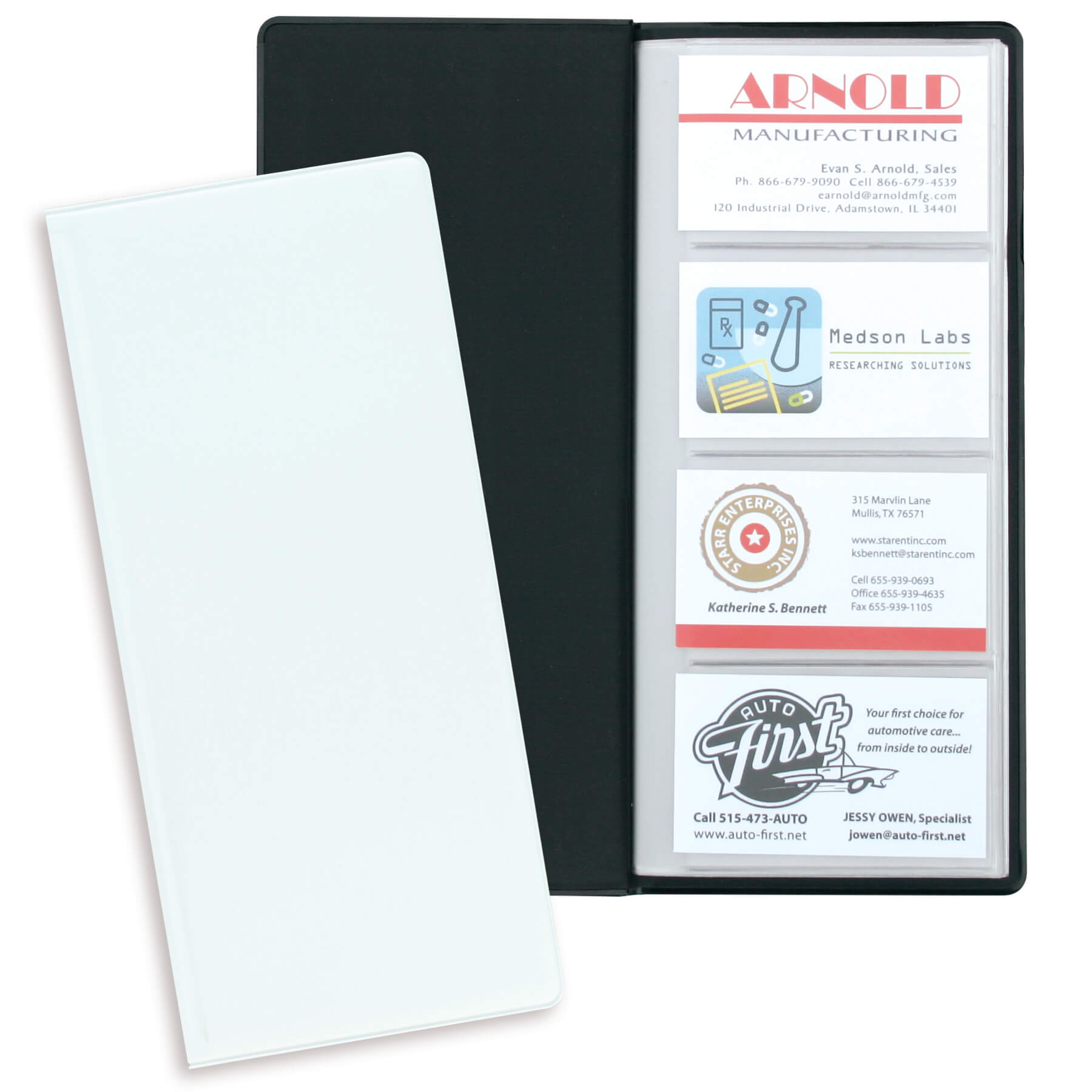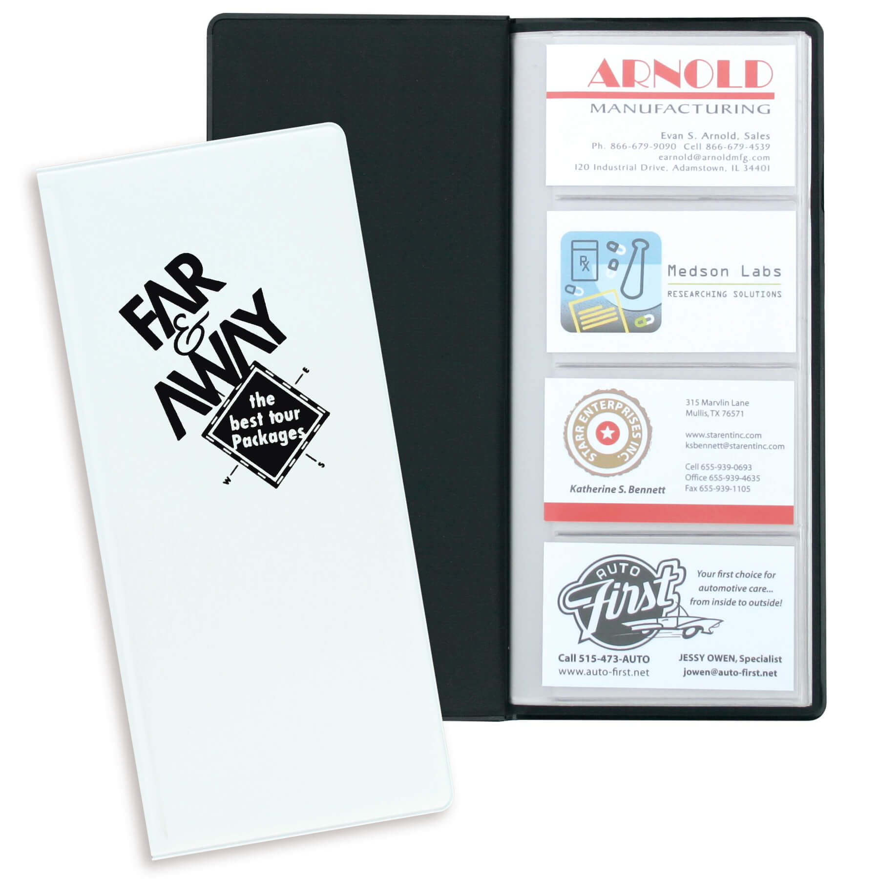 When size matters. this business card case has what it takes! Easily store up to 96 cards in frosty, viewable pockets. Every contact made is vital business information to every business in every industry. Choosing a card case of this magnitude offers you piece of mind for your branding efforts. Complies with Prop 65. 10″ H x 4.5″ W