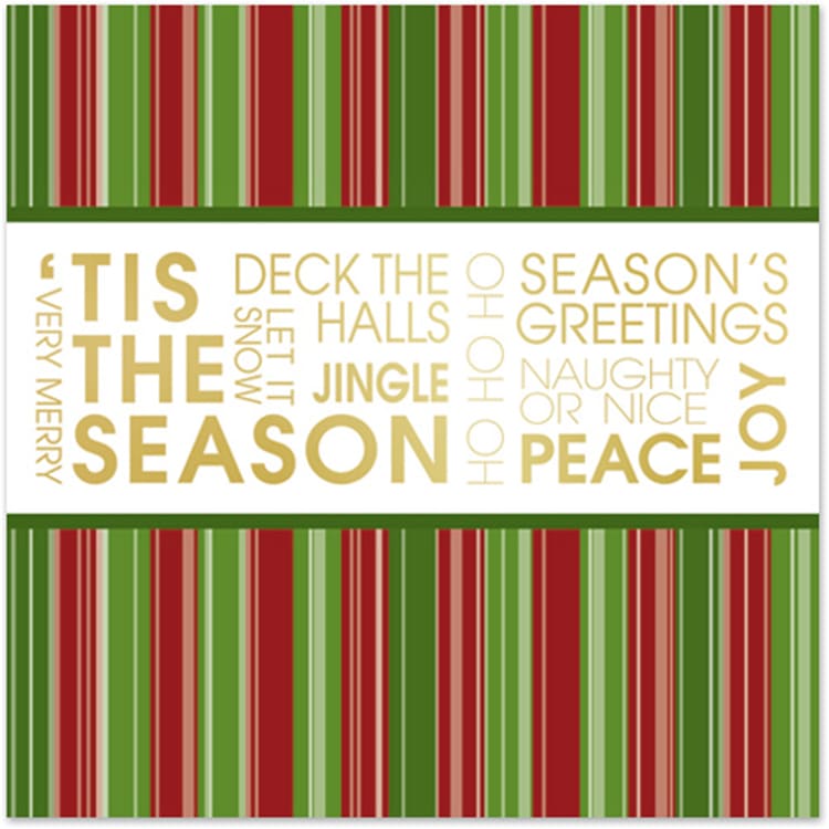 Award Winning Holiday Greeting Cards are the perfect way to convey your personal holiday message! Green & Red stripes w/gold imprint on white stock, includes a 1 color gold foil-stamped stock sentiment & your logo or message w/free gold foil lined mailing envelopes, cards not inserted. See website for 38 stock sentiments or create your own with an additional charge. Over 100 Classic and Premium designs available. 5 3/4″ W x 5 3/4″ H