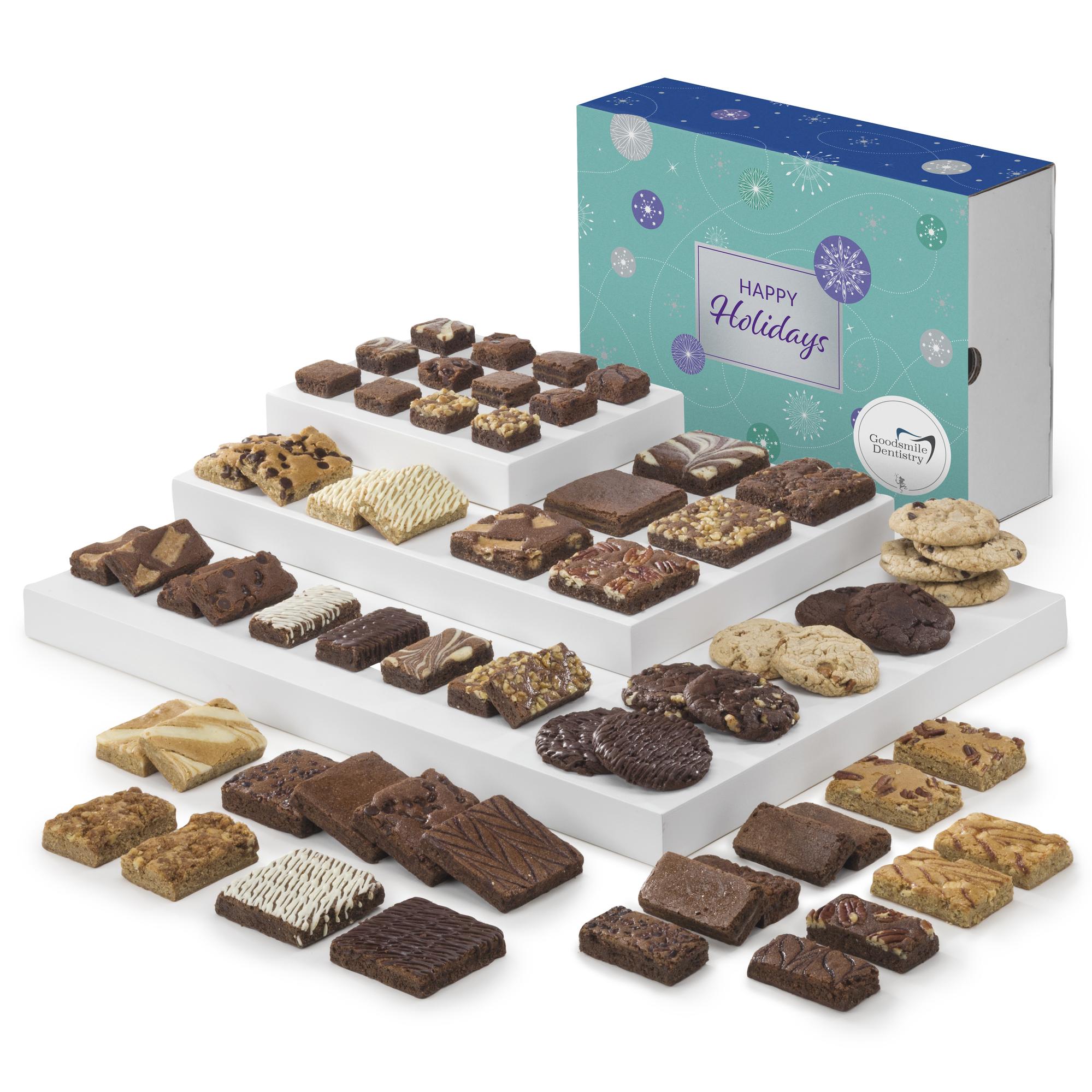 Go above and beyond with a plentiful portion of gourmet creations. Three sizes and 12 flavors of gourmet brownies, six flavors of cookies and six flavors of sweet and buttery bars are included in this crowd-pleasing, giant boxed assortment. Individually wrapped and certified kosher. 78 pieces 8.6 lbs. Complies with OK. 15 1/8″ W x 11 1/4″ L x 4 3/8″ D