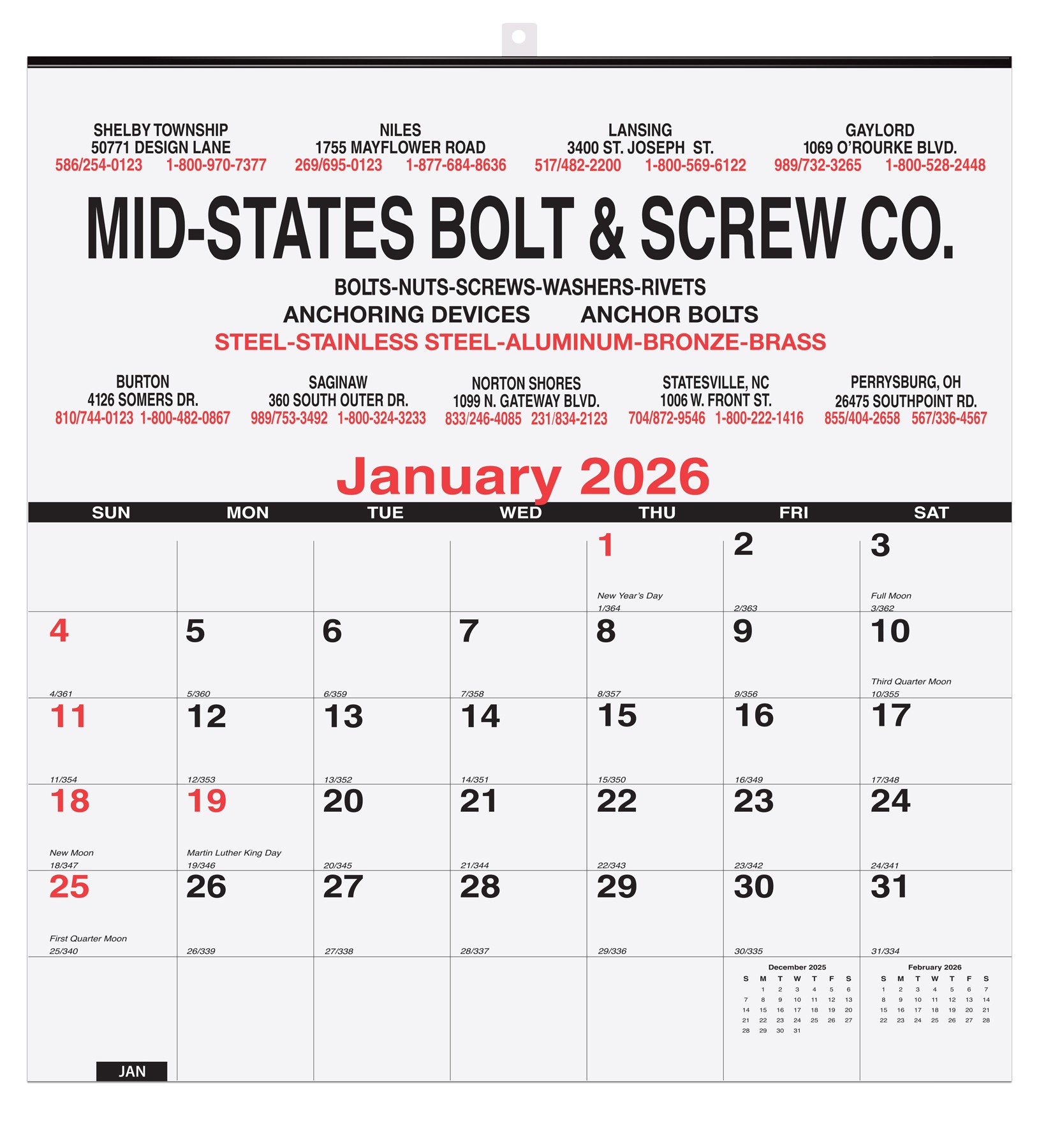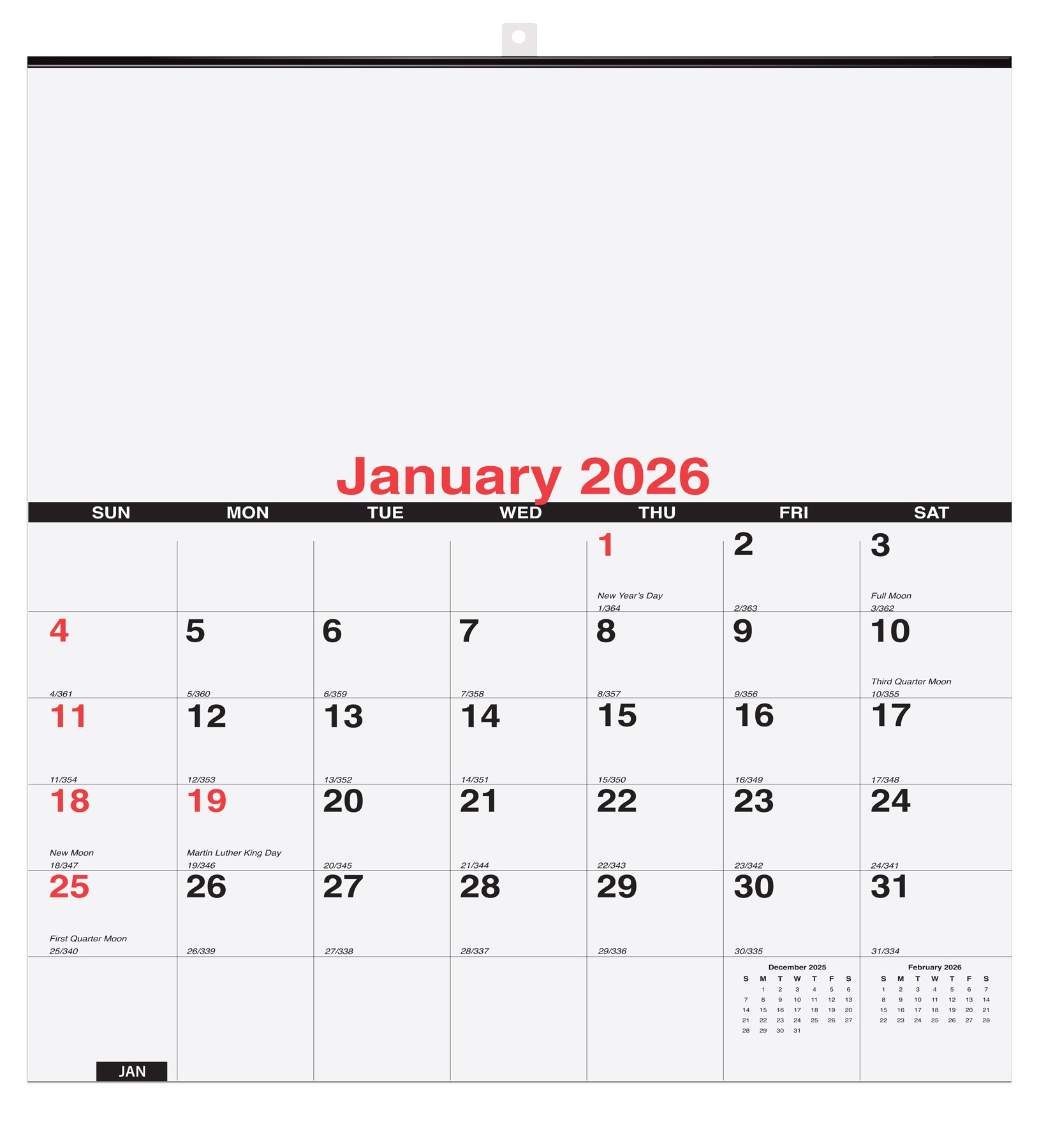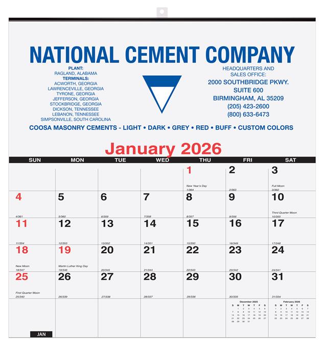 This calendar features 12 sheets of 50 Lb. white offset paper with 12 months (January to December) printed in black and red. Comes bound with black tin at the top and a hanger. 18″ W x 18 3/4″ H