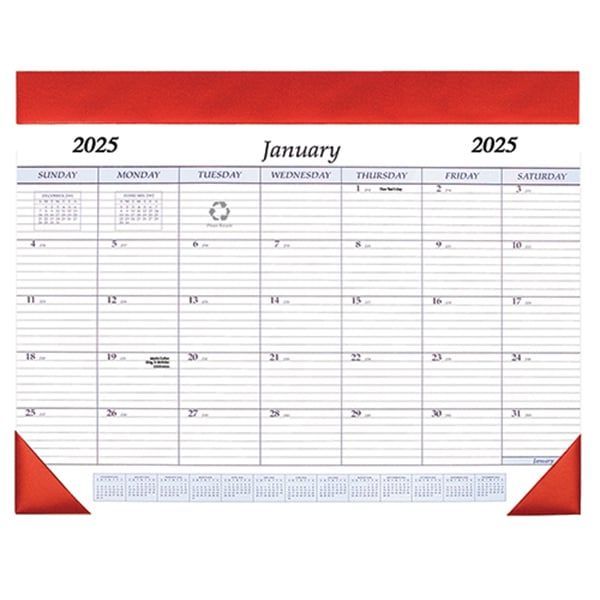 Introducing our premium Desk Pad Calendar, measuring 17″x22″ and refillable for your convenience. Featuring 12 months from January to December, each page is designed with large, faintly ruled squares for easy organization. The calendar also includes a full yearly reference and Julian dating system. With a sophisticated leatherette header and corners, this calendar adds a touch of elegance to any workspace. 17″ W x 22″ H