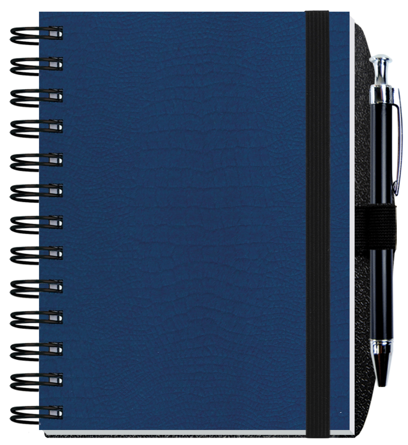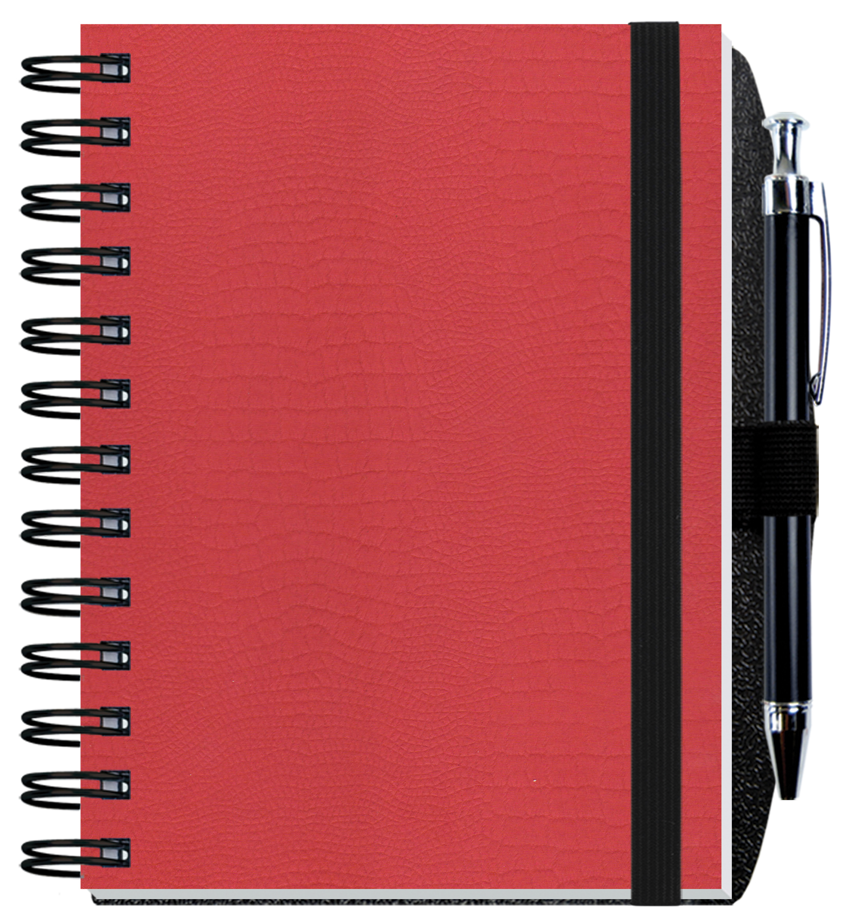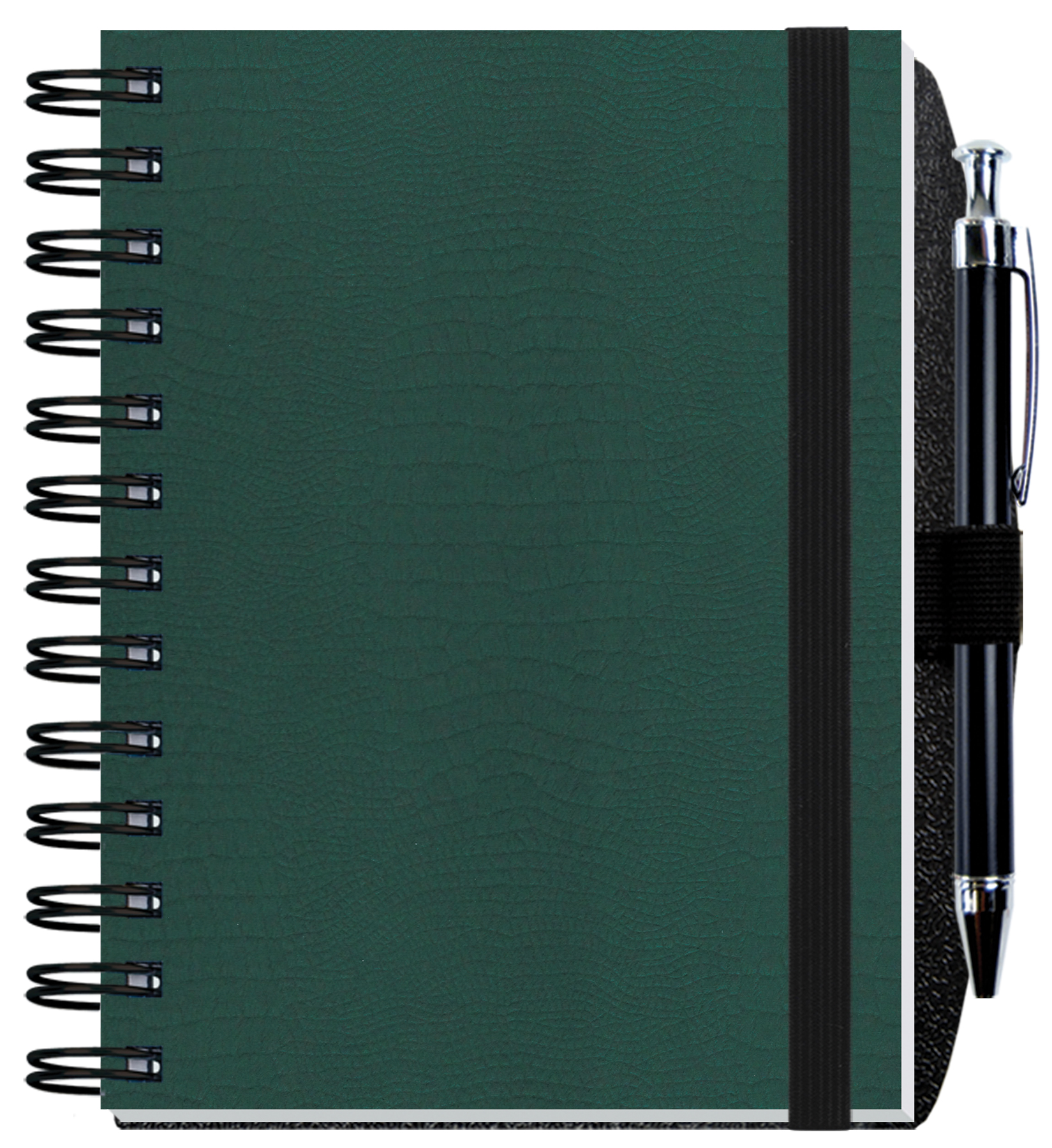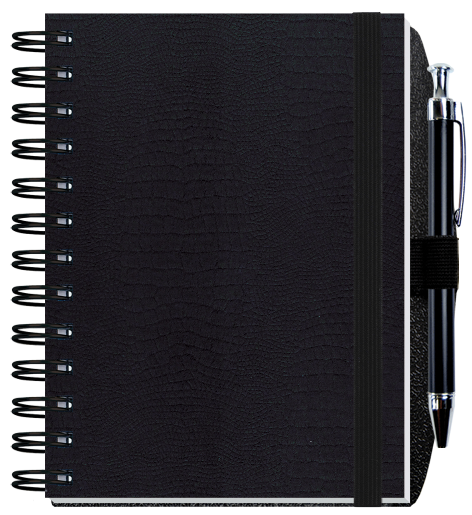 Our Embossed Journals feature sturdy heavyweight paperboard covers with an embossed alligator pattern and 60 Lb. white offset inside sheets with light gray rules or graph printed on both sides. Comes Wire-O bound on the left side with a pen-safe back and a pen. 5″ W x 7″ H