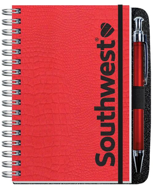 Our Embossed Journals feature sturdy heavyweight paperboard covers with an embossed alligator pattern and 60 Lb. white offset inside sheets with light gray rules or graph printed on both sides. Comes Wire-O bound on the left side with a black pen-safe back and a pen. 4″ W x 6″ H
