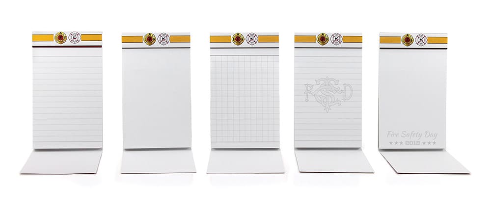 Full coverage 4 color process printing on the front, back and spine on the 12 pt. smooth white cardstock cover is included on this 3″ x 5″ Flip Pad Jotter. It’s the perfect low-cost product for meetings, conferences, office, pocket or purse, and a great tradeshow traffic builder. 30 sheet ruled perforated notepad is standard, Plain, Grid, Watermarked or custom available. Plenty of room to tell your story in full color! Free print template available. Optional inside cover printing available. 3″ W x 5″ H