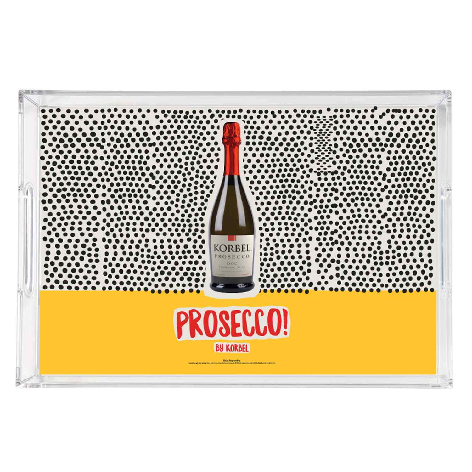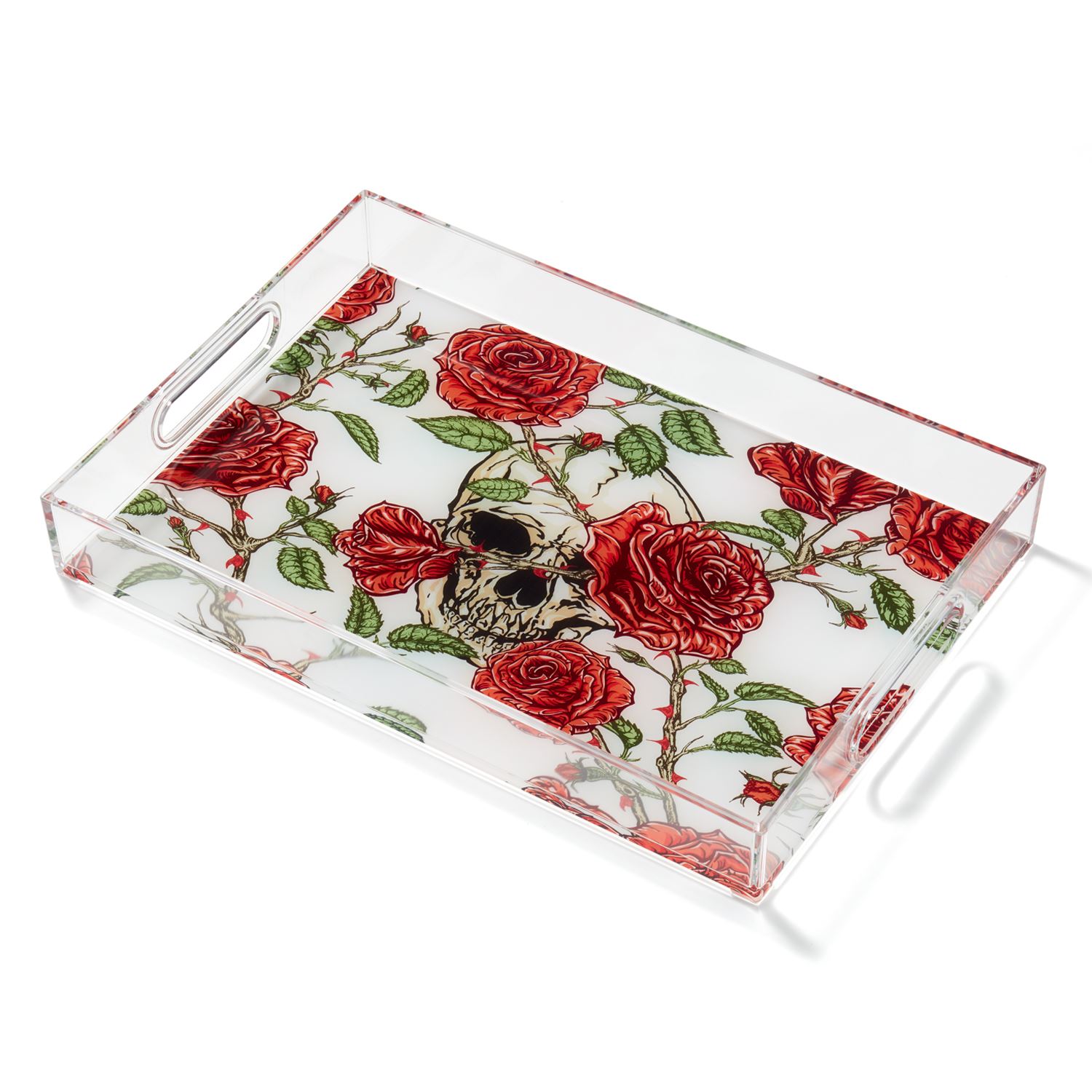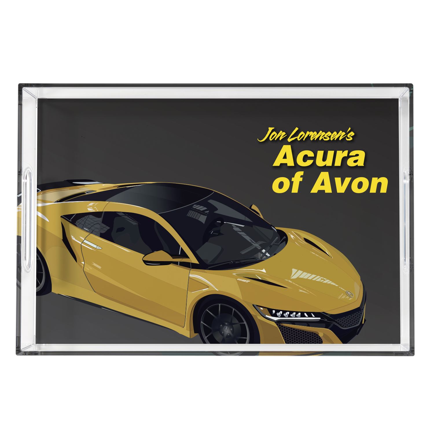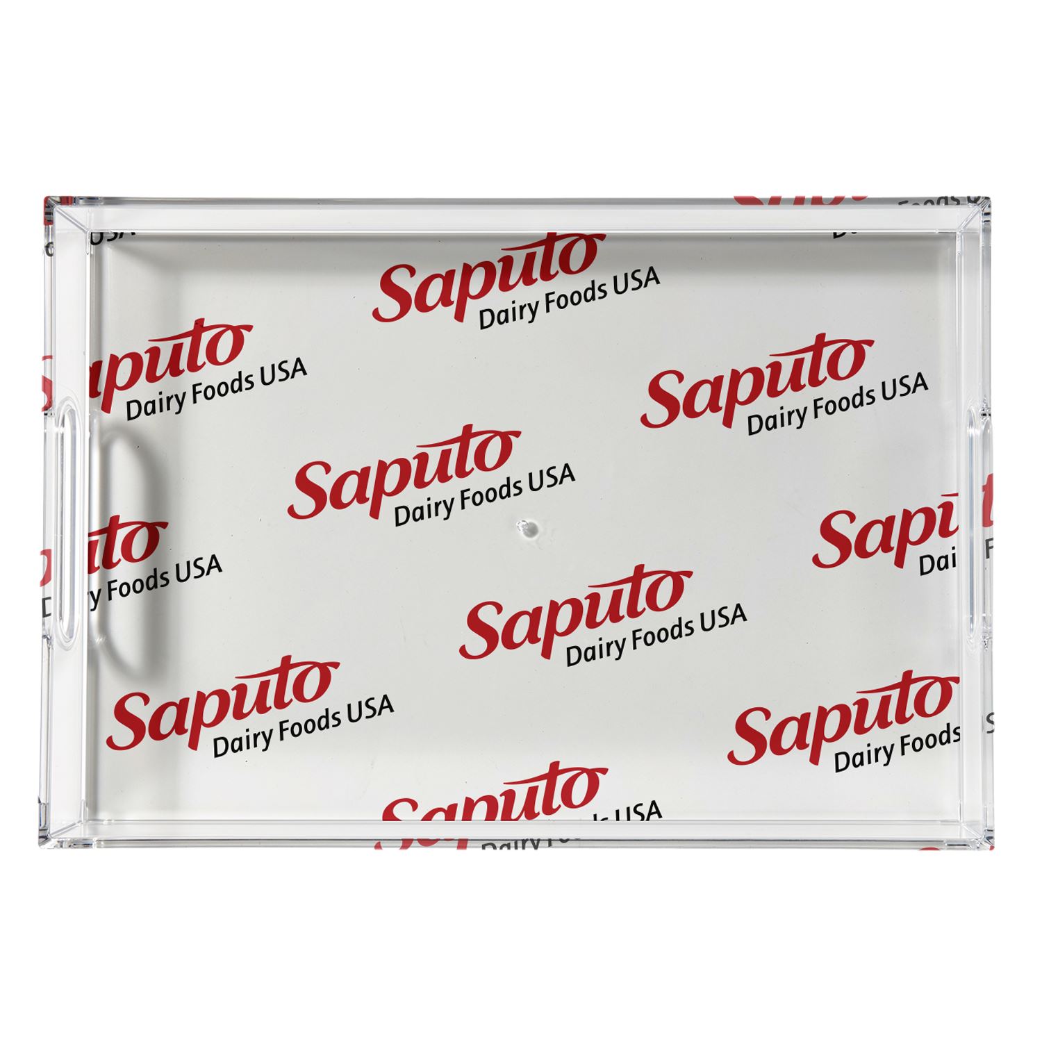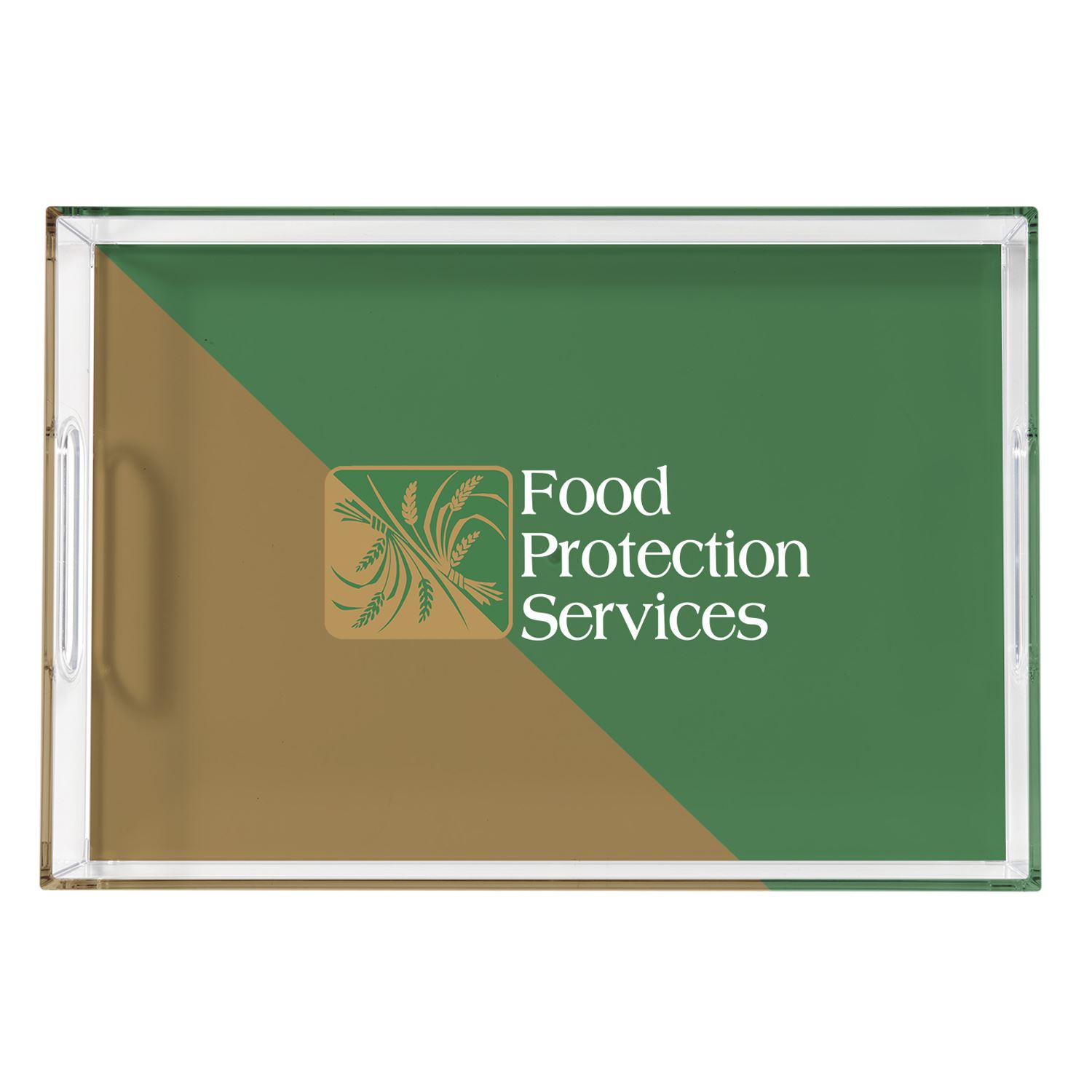 11″L x 16″W clear acrylic serving tray with handles, used for organizing or as a serving tray. Great branding for credit card companies, banks and restaurants. Full-color full-coverage imprint allow for unique and long-lasting vibrant graphics. Food grade safe. Made in the USA. Sold in DOZEN LOTS ONLY. 16″ W x 11″ L