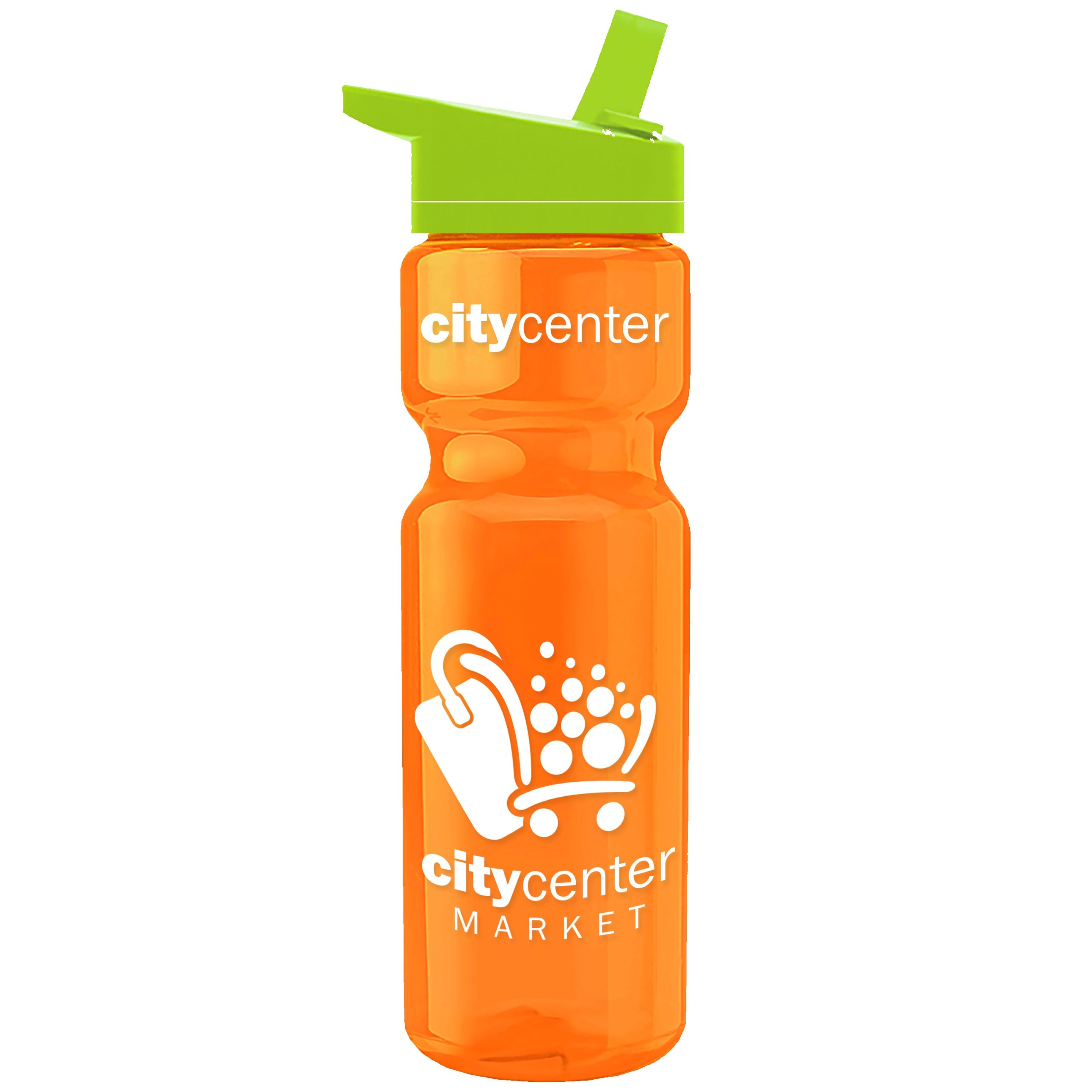 This classic 28 oz. sport bottle features a flip-straw lid with molded carry loop for easy transport and a contoured design for a secure grip. It fits standard bike cages and most cup holders, making it the perfect companion for workouts, commutes, or weekend adventures. With mix-and-match bottle and lid color options, it?s easy to create a standout piece for any promotion. 98% of total product made from post-consumer recycled PET. 2.875″ W x 10″ H x 2.875″ D