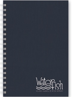 Rich, textured linen mounted to paperboard on front cover with black paperboard back cover. Includes 1-color foil or deboss imprint up to 16 square inches 100 sheets of lined, blank, graph or dot grid paper. Black wire binding is standard; also available in white, bronze and pewter. Made in the USA. Complies with FSC. 7″ W x 10″ H