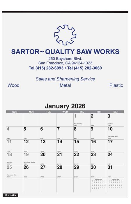 This calendar features 13 sheets of 50 Lb. white offset paper with pre-printed 13 months (December to December), American and major Canadian holidays, moon phases, and Julian Dates. Comes bound with black tin at the top and a hanger. 12 1/4″ W x 18 1/2″ H