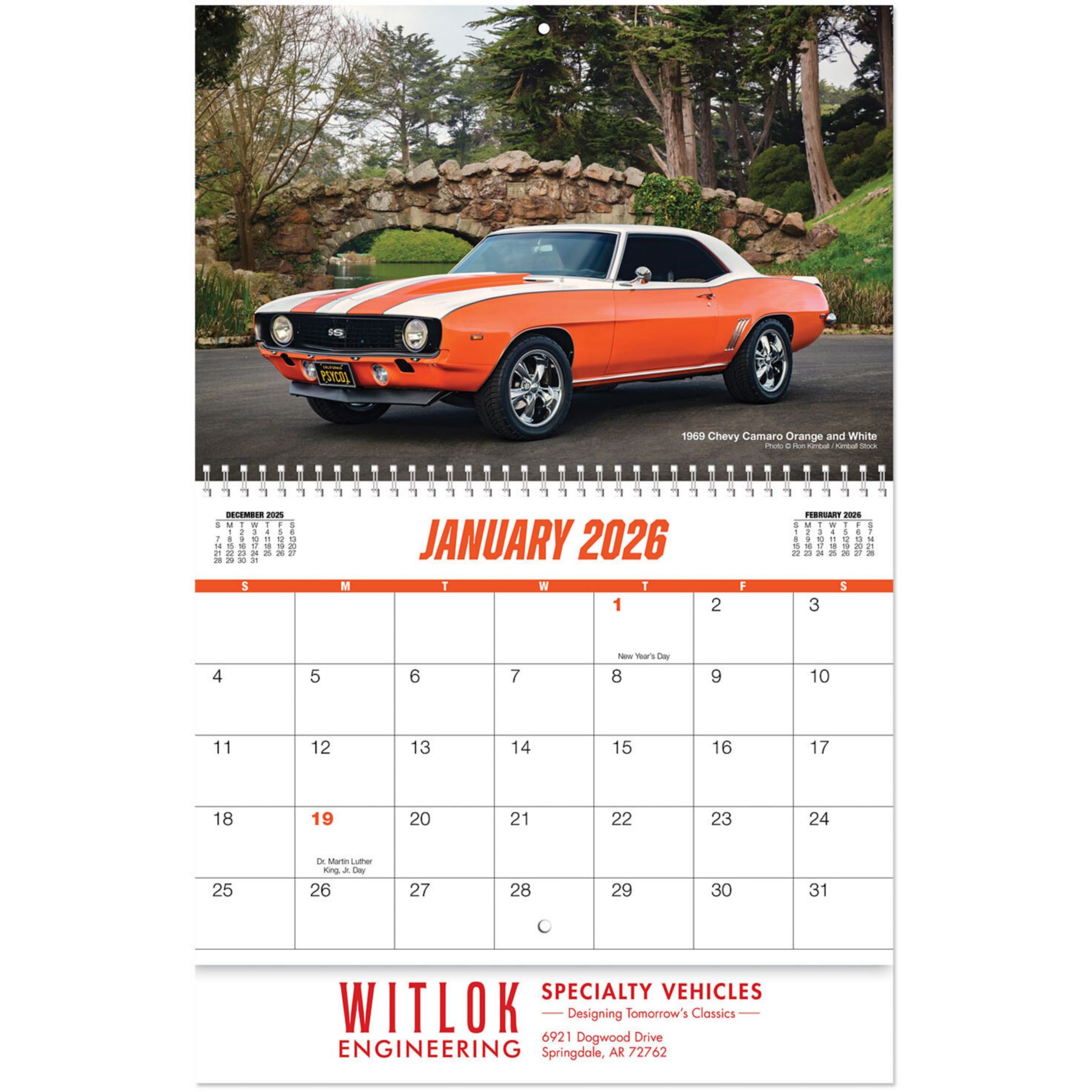 Increase sales by increasing mindshare! Muscle Cars Wall Calendar Spiral. FREE – Up to 4 lines of copy! Available in Desk Calendar. Features some great historic muscle cars. Spiraled; 13 Months. Eco-friendly and Recyclable. Made from 10% post-consumer waste. Complies with Prop 65. 11″ W x 9.625″ H