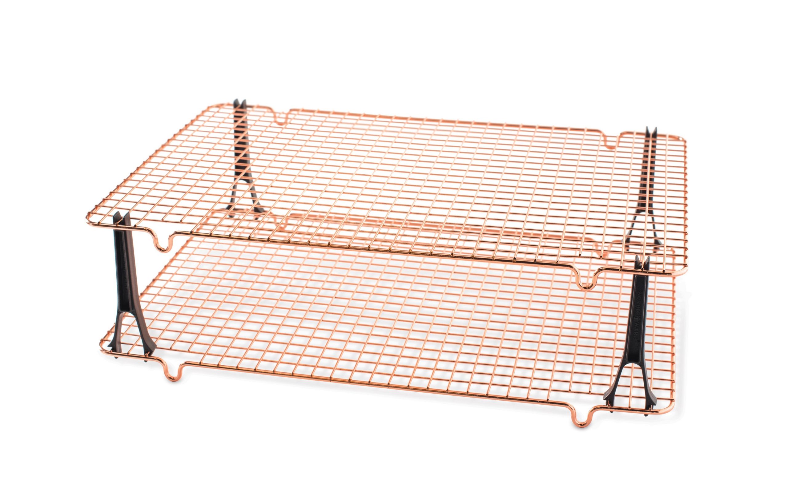 Whats better than one tray of cookies? Two! Especially when theyre efficiently layered in one footprint. Maximize counterspace and storage with these stacking cooling grids. Features two copper plated grids and four black snap-in stackers. Cool two-tiers of baked goods at once! Durable and easy to store. Stackers snap together to stow away in a drawer until you bake again. Perfect for baking in quantity in small kitchens. 16.71″ L x 11.5″ W x 0.75″ H