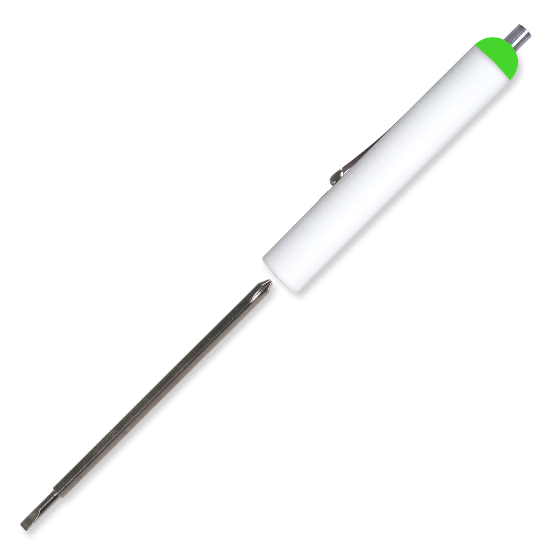 Pocket Screwdriver featuring a reversible 2.5 mm Tech / #0 Phillips head blade screwdriver with a magnet top. Magnet is a super strong neodymium, rare earth magnet that has a 1.5 lb. (24 oz.) pull strength. There is a metal pocket clip on teh barrel. Please specify button/top color on order. Complies with Prop 65. 5.13″ W x 0.5″ H x 0.44″ D
