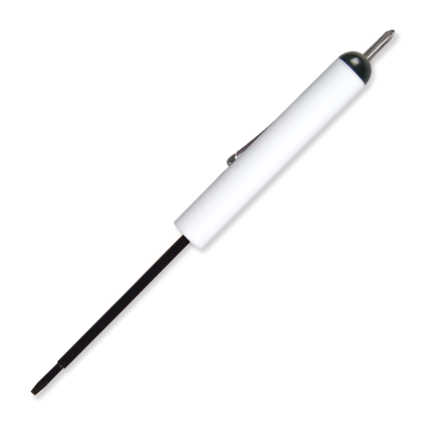 Pocket screwdrivers are appreciated and used by everyone and when was the last time you threw away a tool? Features a #0 Phillips head top with a fixed 2.5 mm tech Blade. Optional Plastic safety tip available. Metal pocket clip. Tool quality tempered steel blades. Please specify button/top color on order. Complies with Prop 65. 6″ W x 0.5″ H x 0.44″ D