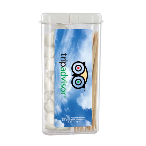 Come out on “top” with this fantastic marketing tool. Choose this Rectangular Flip Top Mint Dispenser and Toothpick Combo as a terrific giveaway during promotional events. Tradeshows, conferences and fundraisers are all excellent choices to hand out this item. Enhance your promotion by ordering this item today. Option to pair your favorite mints with toothpicks, or mix and match between any of our refreshing mint flavors. Contains approximately 25 tooth picks. Complies with Prop 65. 1.75″ W x 3″ H