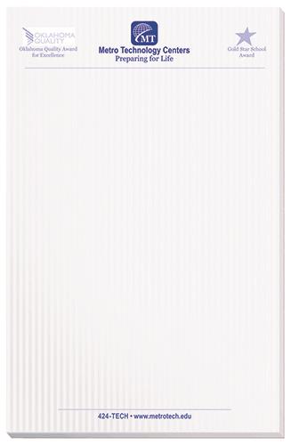 This scratch pad features 50 Lb. white offset paper stock with a chipboard back. Copy up to 5 lines and custom logos to size without screens. 5 3/8″ W x 8 3/8″ L