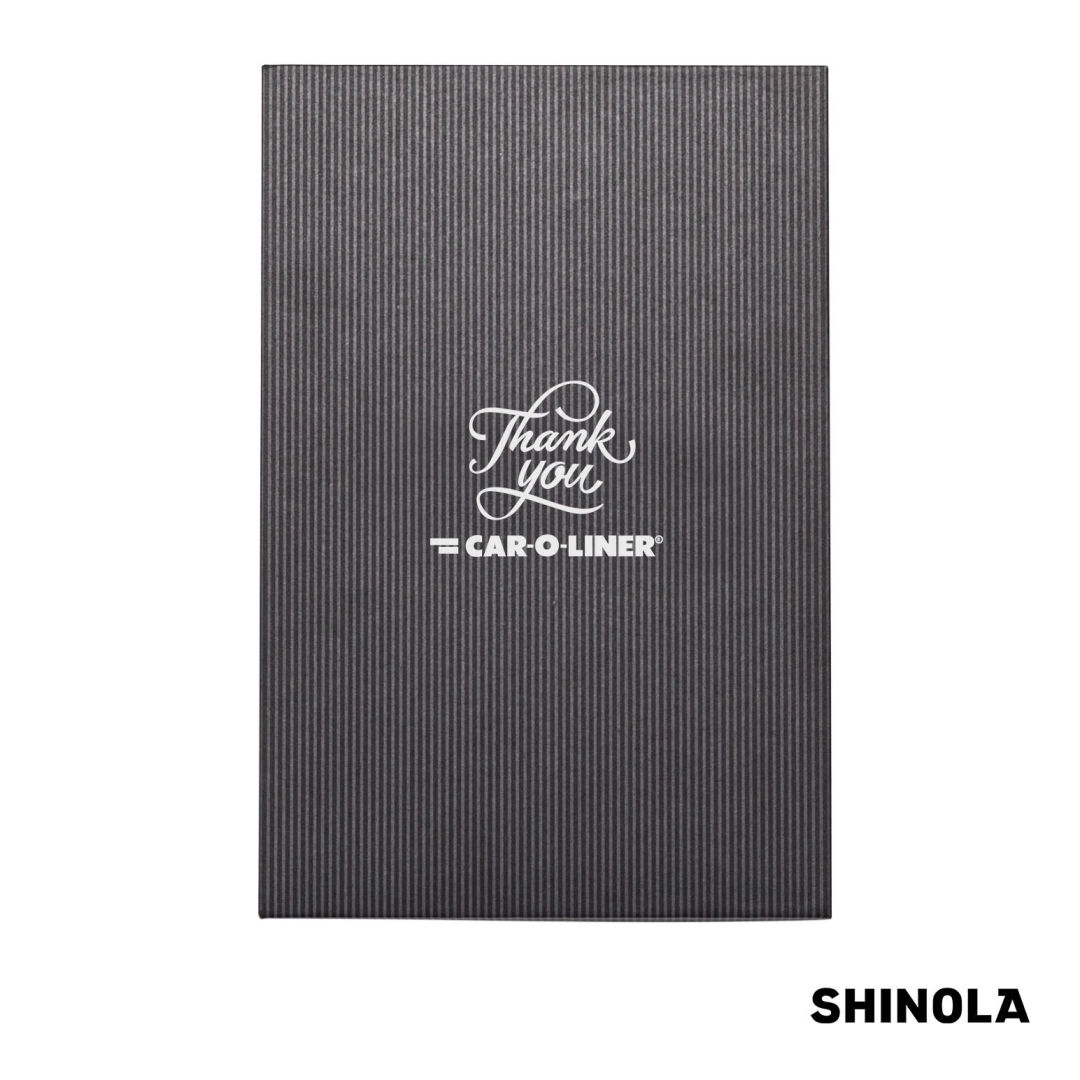 Shinola is a Detroit-based, American luxury lifestyle brand. Shinola journals are American-Made from all US-sourced components and are manufactured to exacting specifications using domestic, sustainably-managed sources for its paper.The Shinola® Hard Cover Journal & Clicker Pen Gift Set Features…P197 Clicker Pen: Aluminum click-action ballpoint pen with medium German made refill. Black die-cut foam Gift BoxCoated Linen HardcoverSmyth sewn, lay-flat binding192 lined, off-white archival-quality pages60 lb. acid-free FSC Certified Paper from sustainably managed American forestsBookmark ribbonGusseted back envelopeMade in the USA*Belly Band & Promo Page Inserts Optional. See Decorating Info for details. 5.25″ W x 8.25″ H