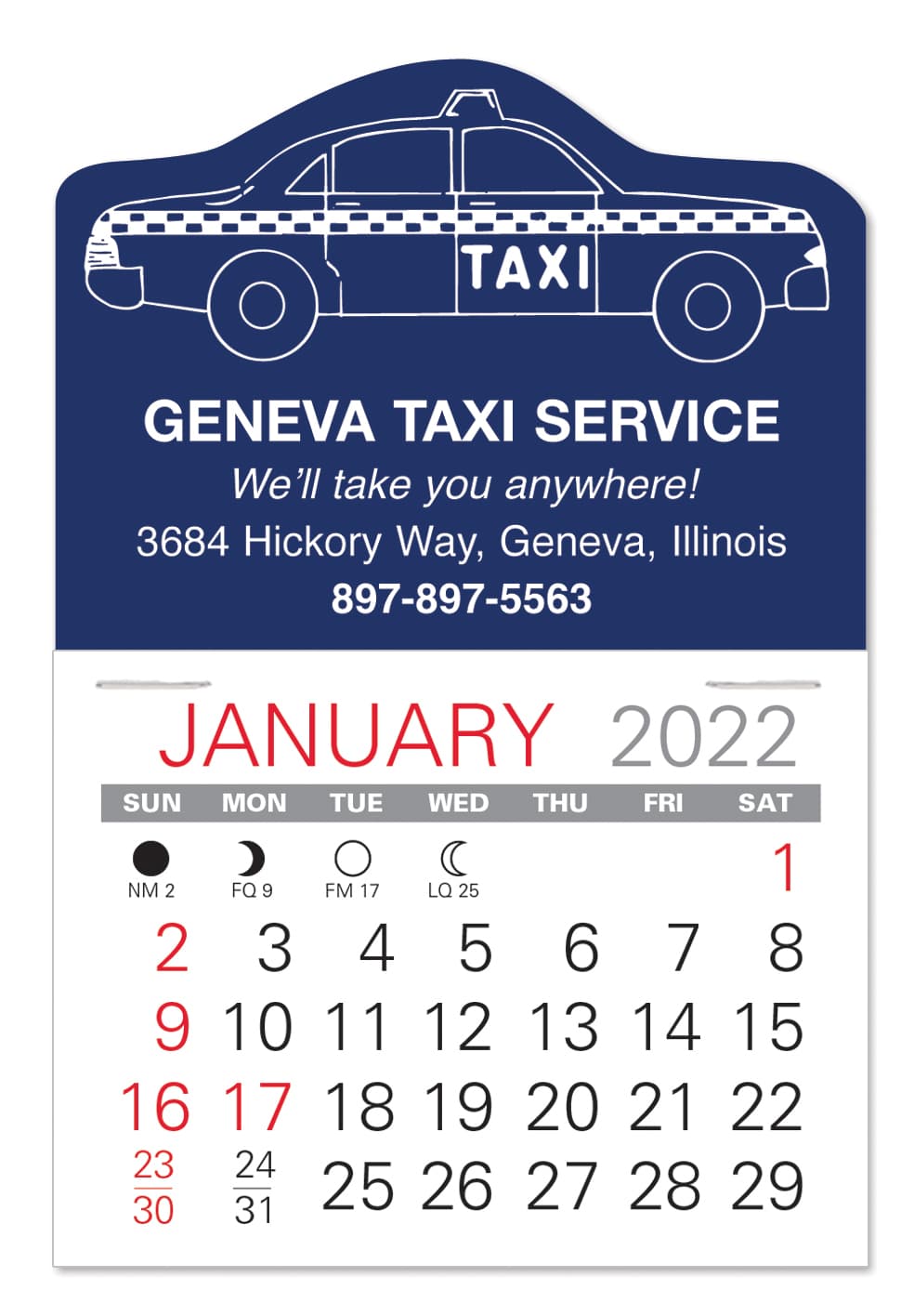 Popular USA Made, low cost, self-adhering Value Stick Adhesive Calendars go almost anywhere to keep your name out front all year long & are easily removed. 27 stock shapes in 6 vinyl colors or create your own custom shape with a small die charge & 1,000 minimum. Packed in a free Counter Display and light enough to mail usually with no additional postage charges. Choose Standard 13 mo. or Spanish 13 mo. date pad. 3″ W x 4 3/8″ H