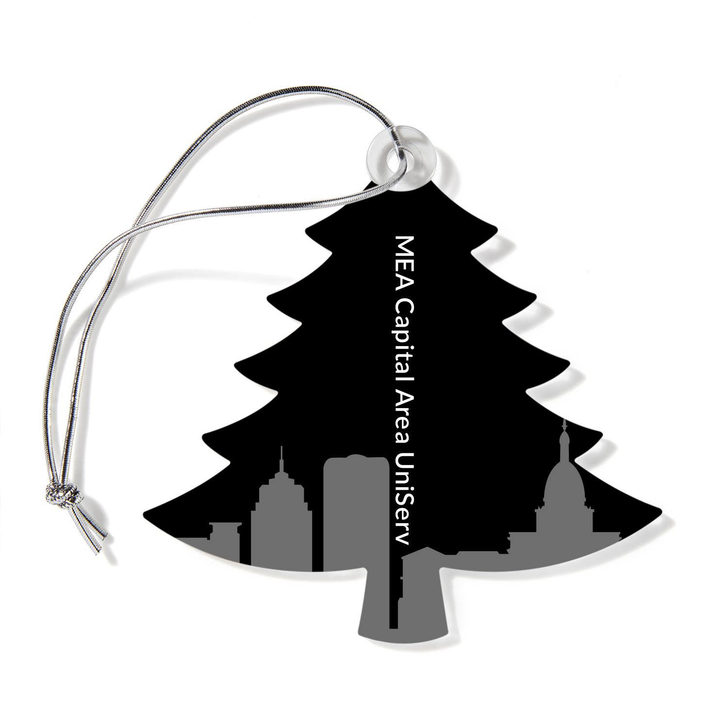 A USA-Made clear acrylic ornament in the shape of a tree, with full-color, full-surface printing. Perfect for a holiday gift, souvenir, or party favor. Includes a silver hanging cord. Each piece is individually poly-bagged. Available in 4 shapes: Bell, Ball, Tree, Snowman. 4″ H x 3″ W