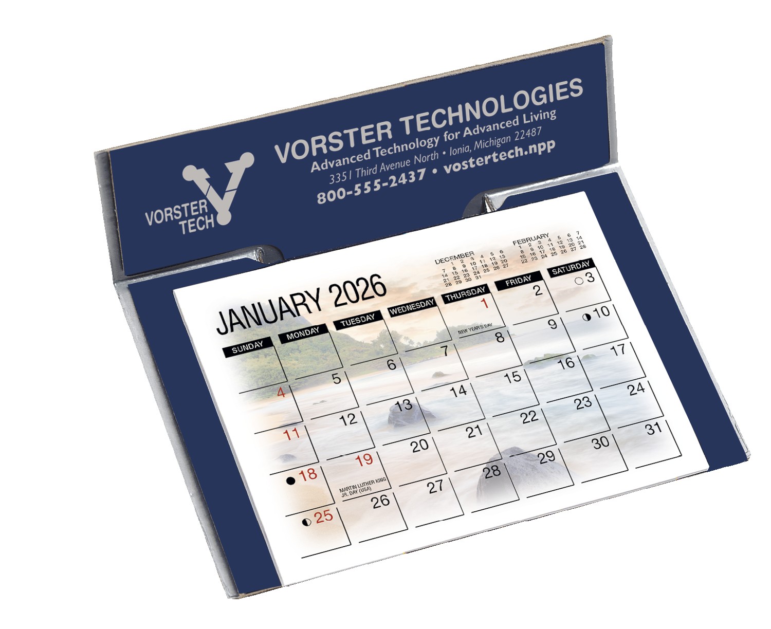 This unique and eye-catching desk calendar offers big color in a compact size. The scenic beauty is always a popular and well-received choice. The cover has a December calendar – perfect for early distribution. The SFI® label means that materials used for this product have been responsibly sourced. 5″ H